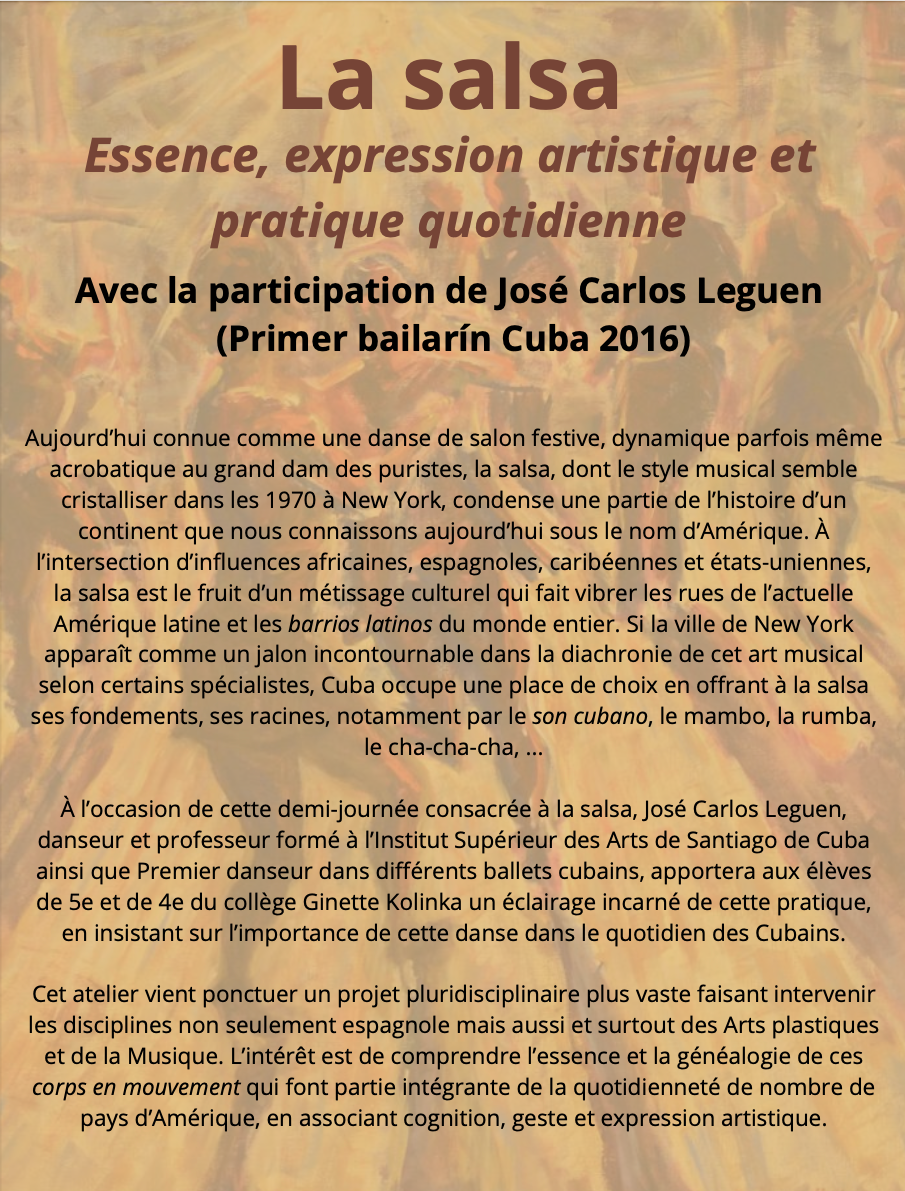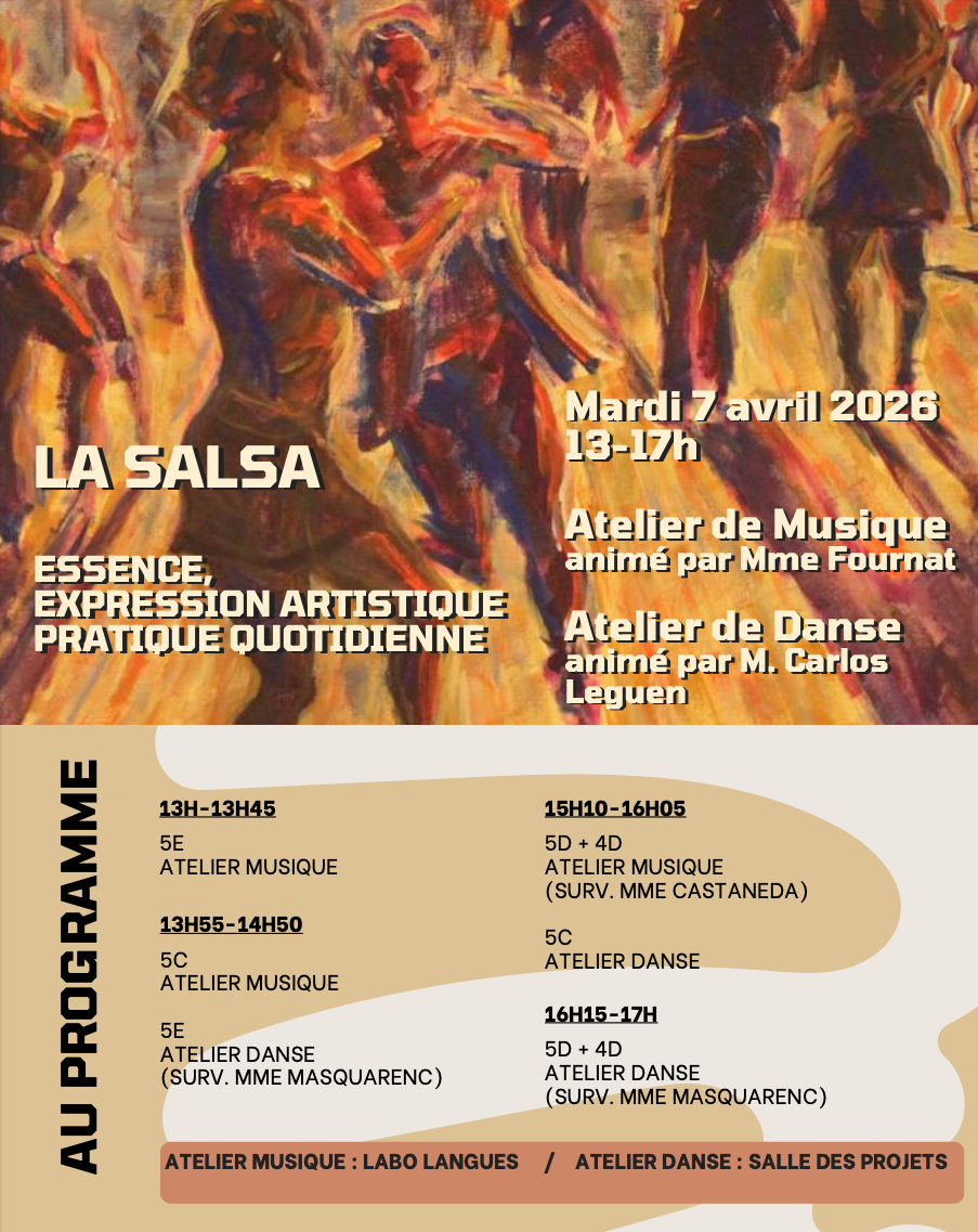 Cet article, rédigé et illustré par Madame Masquarenc, professeure d’espagnol, vous invite à découvrir la salsa ainsi que le programme de la journée :